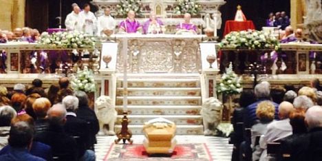 L'ALGUER - Catedral de Santa Maria a l’Alguer plena de amics, fidels i ciutadans per donar l’últim salut a Don Antoni Nughes. Presents lo Cardinal Lluís Maria Martinez Sistach, Arxibisbe emèrit de Barcelona, lo Bisbe Mauro Maria Morfino i tota la Diòcesi. En primera fila també el Síndic Mario Bruno i la Junta comunal. Per l’ocasió, una visita especial: la Mare de Déu de Vallverd. les imatges de la Santa Missa.