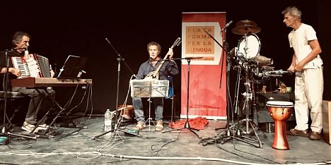 ALGUER - Dissabte la Plataforma per la Llengua ha continuat la celebració dels 25 anys d’activitat amb el “Dinar per la Llengua” amb l’acompanyament de l’artista alguerés Claudio Gàbriel Sanna que ha cantat amb el trio Rall, Josep Cols al piano i Andreu Ubach a la bateria vertical i percussions. L’alguerés sempre present a les activitats de l’associació que promou el català en tot lo domini lingüístic: los “dinars” són escomençats just en aqueixa ciutat, lo 25 d’abril amb la Paella per la Llengua, oferta a la plaça del Quarter, amb el concert de Quico Pi de la Serra i Maria del Mar Bonet, a dins del Festival BarnaSants.