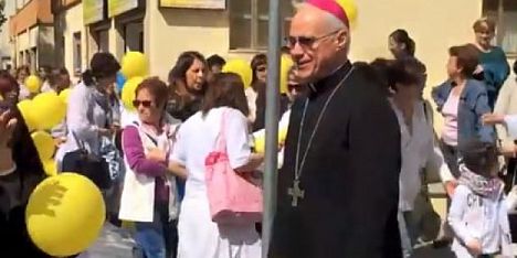 Centenars de botxes colorades al cel a damunt de l’iglésia del Rosari on el Bisbe ha aguardat la passejada dels minyons pel dia de la "Iglésia per l’escola“