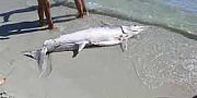 Il pesce spada spiaggiato, di un metro e mezzo circa, è stato notato da alcuni bagnanti: «era sventrato e con un grosso taglio sul dorso» lo ha descritto uno di loro che ha inviato la foto al Quotidiano di Alghero